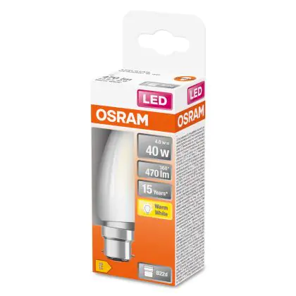 Beschrijving Osram LED B22D Kaars Filament Mat 4W 470lm - 827 Zeer Warm Wit | Vervangt 40W
